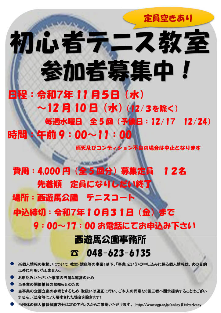 「西遊馬公園 初心者テニス教室」参加者募集中!~定員に空きあります~